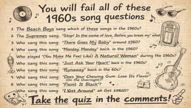 7/10 is what people on average are scoring in this 1970s songs quiz so far. Are you ready to answer questions like "Who sang this song : "Monday, Monday" back in the 1960s?" and "The Beach Boys sang which of these songs in the 1960s?"
