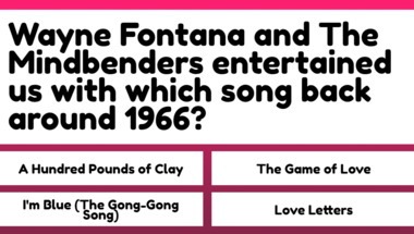4/10 is what people on average are scoring in this 1960s Songs quiz so far. Are you ready to answer questions like "Stevie Wonder entertained us with which song back around 1967?" and "Wayne Fontana and The Mindbenders entertained us with which song back around 1966?"