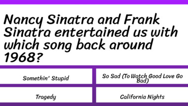 Look forward to questions like "Nancy Sinatra and Frank Sinatra entertained us with which song back around 1968?" and "Scott Mckenzie entertained us with which song back around 1968?"