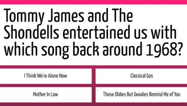 Look forward to questions like "The Hollies entertained us with which song back around 1967?" and "Tommy James and The Shondells entertained us with which song back around 1968?"
